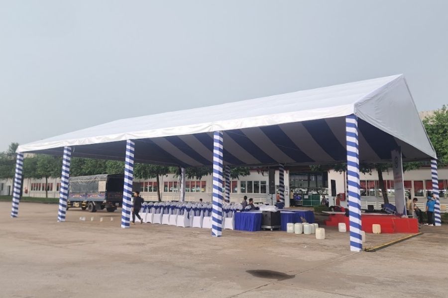 - Bảo vệ tuyệt đối trước mọi điều kiện thời tiết: Hệ thống mái bạt được làm từ chất liệu bạt Tarpaulin hai lớp có khả năng chống tia UV và chống thấm nước hoàn hảo, giúp khách mời luôn cảm thấy thoải mái dưới nắng gắt hay mưa rào. Kết cấu khung giàn chắc chắn được tính toán chịu lực kỹ lưỡng, giúp sự kiện diễn ra xuyên suốt mà không bị gián đoạn bởi các yếu tố tác động từ môi trường bên ngoài.