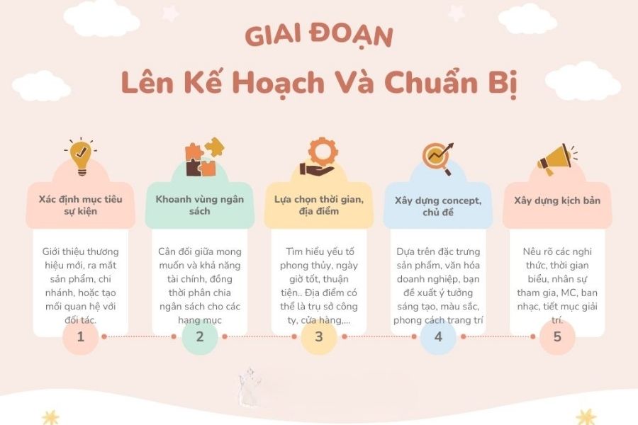 Việc thiết lập một quy trình làm việc khoa học sẽ giúp bạn quản lý sự kiện hiệu quả và tránh được những sai sót không đáng có. Quy trình tổ chức lễ khai trương là gì thường bao gồm các bước cụ thể như sau: