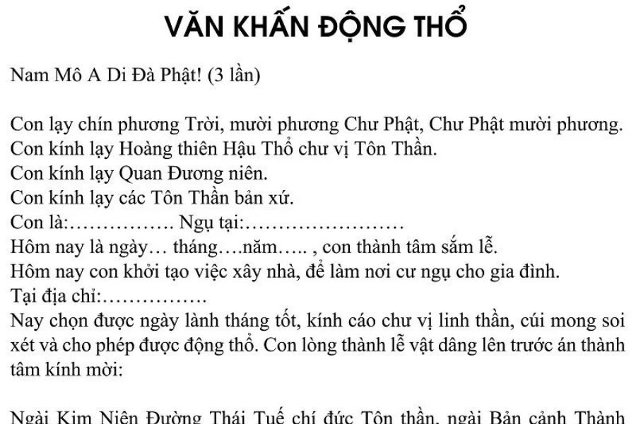 Nam mô A Di Đà Phật! Nam mô A Di Đà Phật! Nam mô A Di Đà Phật! Con lạy chín phương Trời, mười phương Chư Phật, Chư Phật mười phương. Con kính lạy Hoàng thiên Hậu Thổ chư vị Tôn thần. Con kính lạy Quan Đương niên hành khiển Thái tuế chí đức Tôn thần. Con kính lạy các vị thần linh bản xứ, thổ địa cai quản trong khu vực này. Hôm nay là ngày... tháng... năm... Tín chủ con là... ngụ tại địa chỉ... thành tâm sắm sửa lễ vật, hương hoa, trà quả dâng lên trước án. Tín chủ con khởi tạo xây dựng ngôi đương cơ trụ trạch để làm nơi cư ngụ/kinh doanh. Nay chọn được ngày lành tháng tốt, kính cẩn thưa trình chư vị Thần linh, cúi xin được phù hộ độ trì cho công việc hanh thông, vạn sự tốt lành, thợ thầy bình an, công trình bền vững.