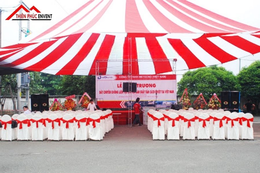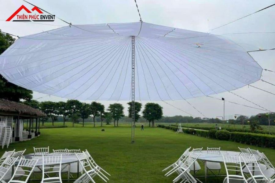 - Chất liệu vải dù: Vải dù cần đáp ứng yêu cầu chống tia UV và chống thấm nước. Điều này giúp bảo vệ khách mời và thiết bị bên dưới, đồng thời duy trì tính thẩm mỹ suốt thời gian sử dụng.