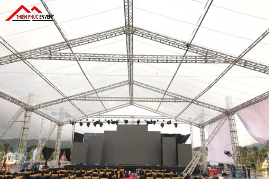 Quy trình lắp đặt nhà bạt không gian tại Sự Kiện Thiên Phúc được thực hiện theo đúng trình tự kỹ thuật, sử dụng hệ thống khung kim loại chắc chắn và bạt che phủ đạt tiêu chuẩn, đảm bảo độ ổn định trong các điều kiện thời tiết khác nhau. Việc kiểm tra an toàn trước khi bàn giao luôn được chú trọng nhằm đảm bảo sự kiện diễn ra liên tục, không gián đoạn.